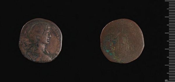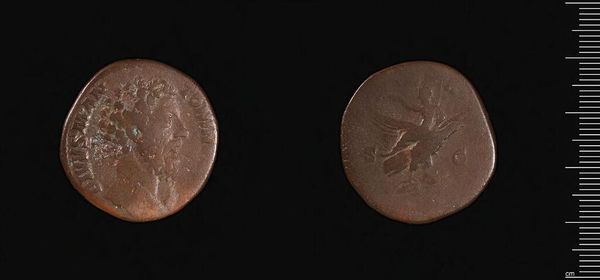 Curator: This artifact is a sestertius, a Roman coin, depicting Commodus. Even on this tiny surface, his image looms large. Editor: It feels weighty, doesn’t it? I mean, metaphorically. The heft of empire, pressed into this bronze disc. Curator: Indeed. Coins like these served as a propaganda tool, shaping public perception of the emperor. Each symbol carefully chosen. Editor: So, what statements were they making? I can make out two figures on the reverse. Curator: The figures depict a sacrifice scene, possibly emphasizing Commodus's role in upholding religious traditions and maintaining the pax deorum, the peace of the gods. Editor: Interesting how even the smallest objects can speak volumes about the politics of their time. Curator: Absolutely. They are echoes of power, resonating across millennia. Editor: Yes, an echo that reveals the ongoing interplay between leadership, legacy, and iconography.