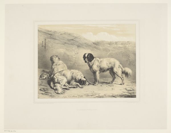 Curator: Editor: This is "Three Hunting Dogs in a Landscape" by Willem Philip van der Veken, likely created between 1873 and 1899. It's a print, giving it a kind of gritty texture that suits the natural subject matter. I’m struck by the details captured. How does this print fit into its social context? Curator: Excellent observation! This piece speaks volumes about 19th-century leisure and class. These hunting dogs represent a particular kind of access, doesn't it? Consider the materials involved in creating and consuming this print: the paper, the etching tools, the printing press, even the ink. These point to an economy where leisure activities like hunting, and art depicting it, are commodities. Who had access to these activities, to land ownership that allowed for hunting? Editor: So it’s about access and who gets to enjoy certain activities, reflected in the material means of production? Are you suggesting that the act of creating and owning the print is also a kind of "hunting?" Curator: Precisely. The labor involved in creating this print and the resources needed to acquire it parallel the exclusivity represented by the hunt. How was this print distributed and who were its likely consumers? Did the material realities influence the style or content? Editor: It makes me consider how this print was circulated. Was it mass-produced? Limited edition? And to what extent were the tools used affecting its perceived value and availability to the population? Curator: Think about it! And who has access to it today, materially, digitally? Editor: Interesting to see art through a lens of the materials involved in both the artwork’s production and its subject! Thanks! Curator: My pleasure! Seeing art this way really enriches our understanding.