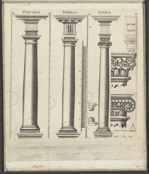 This engraving, titled "Korinthisch hoofdgestel met zes consoles" and created by Johannes or Lucas van Doetechum, presents a study in architectural form. The composition is neatly organized, showcasing various elements of Corinthian design. The use of line is dominant, delineating the intricate details of each component, from the fluted column to the ornate consoles. This emphasis on structure allows us to examine the historical and philosophical underpinnings of classical architecture. The ordered arrangement, combined with decorative motifs, invites a semiotic reading, wherein each element—the acanthus leaves, the volutes, the dentils—functions as a signifier of classical ideals of harmony and proportion. The print encourages an ongoing dialogue between the viewer and the architectural forms, inviting interpretations that extend beyond mere aesthetics. The structured layout emphasizes not only the practical aspects but also the symbolic weight carried by architectural design.