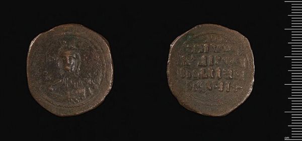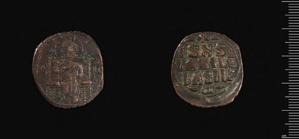 Editor: This is an anonymous Follis coin from the Harvard Art Museums. It's a small, unassuming object, but I'm struck by how much history it holds in its worn surface. What stories do you think its imagery tells? Curator: The images, even worn, speak volumes. On one side, we see an image of Christ, a powerful symbol of faith and authority. The other bears inscriptions, likely invoking divine blessing. Consider how this iconography reinforces both religious and political power. Editor: So, the coin is not just currency, but also a form of propaganda? Curator: Precisely. Every image, every inscription, served to reinforce the legitimacy of the ruler and the dominance of the prevailing belief system. How do you think that visual language resonated with the people who used this coin daily? Editor: It's amazing to think about how much meaning could be packed into something so small. I’ll never look at a coin the same way again.