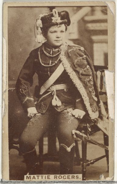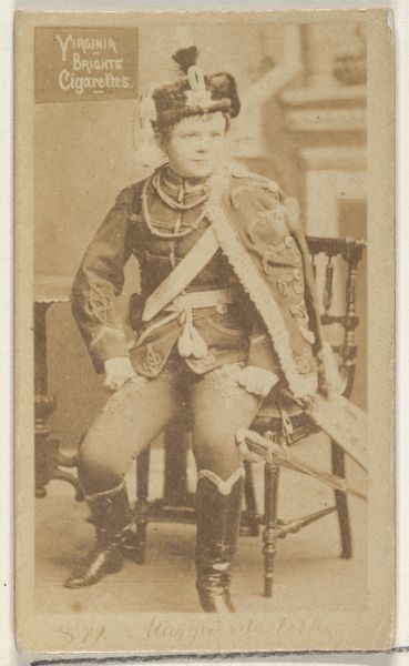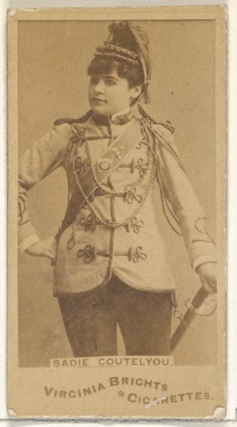 Curator: Let’s turn our attention to this commercial card dating back to the 1880s, “Card Number 158, Miss Marie Jansen” printed to promote Cross Cut Cigarettes by W. Duke, Sons & Co. Editor: It has such a nostalgic sepia tone. It immediately creates a connection to a specific moment in the past. Curator: Indeed. Notice the tight framing, the subject, Miss Jansen, positioned centrally, reinforcing a hierarchy of image-making, designed, presumably, to catch the eye in a commercial context. Semiotically, it is about codes, presentation and audience. Editor: The material aspect is key here. These cards, flimsy yet ubiquitous, functioned as both promotional material and collectibles. The production process, probably involving mass printing techniques, allowed Duke & Sons to infiltrate various levels of society with imagery of refinement and performance. Curator: Observe the intricate detail in Miss Jansen's military-inspired attire. The symmetry, the carefully rendered fabric textures; there is clear effort invested in creating a visually compelling figure. Her outfit speaks to prevailing notions of power and gender roles in spectacle. Editor: Precisely! Consider the socio-economic implications of such commercial art. Cheaply produced using unskilled or low-skilled labor, they paradoxically aimed to sell luxury items appealing to aspirations of the rising middle classes. The circulation of these images reinforced certain values and lifestyles tied to tobacco consumption. Curator: Note too, the strategic placement of text: "Cross Cut Cigarettes are the best." This reinforces a reading of the entire card as advertisement rather than artistic merit. Yet this interplay of text and image makes the composition work, regardless of the overt consumerist intent. Editor: Looking at the material conditions behind this, we are able to understand that even something so trivial as a cigarette card participated in broader systems of capital, consumerism, and class aspiration. Curator: What strikes me is the clever manipulation of signifiers and artistic skill. It's quite captivating, irrespective of what one feels about consumer culture! Editor: Ultimately, by examining these humble cards through their materiality, their making and purpose, we access the complex cultural and labor dynamics of the late 19th century.