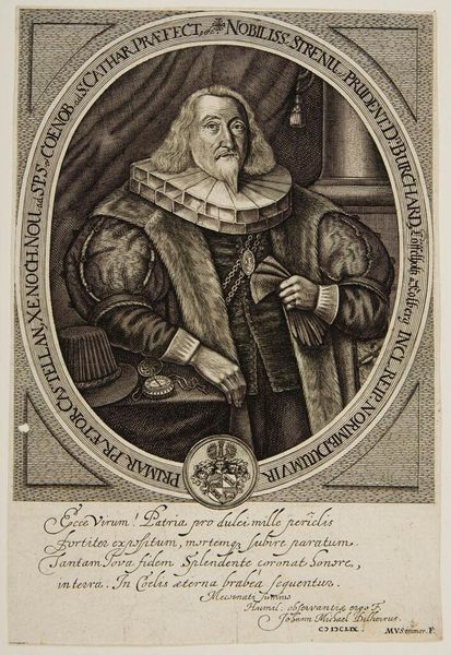 Curator: This is a portrait of Christophe Peller, engraved by Jan Faber the Younger. The print captures Peller framed in an oval cartouche, looking every bit the eminent scholar. Editor: My first thought is of power, that crisp ruff and cascading wig project such an intense image of authority. The gaze is direct, almost challenging. Curator: It's interesting you say that, because he’s positioned with these papers in hand and a scholar's cap beside him, suggesting intellectual prowess. It feels performative, doesn't it? Editor: Absolutely. It speaks volumes about the construction of identity and status. We see these symbols, like the chain, all carefully placed to build this persona. Curator: These aren't just aesthetic choices; they're intentional signifiers within the societal framework. Even the Latin inscription is a statement of his erudition. Editor: Yes, and it reminds us that representation is always strategic. Peller is curating his own image, with Faber's assistance, to cement his place in history. Curator: Well, considering we are still discussing it now, I would say they succeeded! Editor: Precisely, that’s the enduring power of portraiture, isn't it?