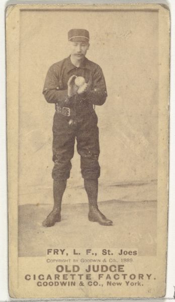 This small albumen silver print was produced by Goodwin & Company around 1888 as part of a series of baseball cards for the Old Judge Cigarette brand. The image depicts Philip Louis "Phil" Knell, a pitcher for the St. Joseph Clay Eaters. During this period, baseball cards were tools of commerce, advertising cigarettes and other products, rather than celebrating athletic achievement. These cards were almost exclusively of white players, reinforcing the color lines in professional sports, and effectively excluding Black athletes. Knell’s serious expression, his hands clasped tightly, provide a glimpse into the intense pressure on these young men as they navigated the burgeoning world of professional baseball. This tension is heightened by the knowledge that the sport, seemingly wholesome, was intertwined with the tobacco industry. In its way, this card encapsulates the complex intersections of commerce, sport, and identity at the end of the 19th century.