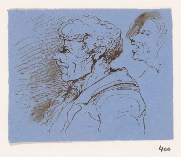 Editor: Here we have a drawing called "Jager met vrouw pratend over het schieten van een wolf," or "Hunter with woman talking about shooting a wolf" by Johannes Tavenraat, created in 1846 using ink on paper. There is such starkness in the faces. What strikes you most about this work? Curator: I’m immediately drawn to how Tavenraat positions this very intimate scene within a broader social context. Genre paintings like this one, focusing on everyday life, really took hold during the 19th century, especially as industrialization and urbanization transformed Dutch society. Editor: So, what were viewers meant to take away from that? Curator: These weren't simply illustrations of rural life. Instead, think of them as visual arguments about national identity and values. How does the contrast in attire emphasize the power dynamic? The hunter’s hat versus her headscarf? Editor: That's a really good point about the attire - it’s like he’s showcasing a rugged, independent male identity next to a more demure femininity, solidifying those traditional roles in Dutch culture at the time. Did that reinforce a sense of national pride, particularly after a period of upheaval like the Napoleonic era? Curator: Precisely. These images subtly promoted stability and tradition. What can you discern from the text within the artwork itself? Does that offer insight into the relationship depicted, or perhaps hint at social commentary embedded within the piece? Editor: The text definitely adds another layer. He seems proud, maybe a little boastful about his hunting prowess, and she appears to be acknowledging his skill… It solidifies the narrative. It’s fascinating how a simple drawing can reveal such intricate layers of cultural meaning. Curator: Indeed. By looking at art as a product of its social and historical moment, we start to see how images actively participate in shaping cultural narratives.