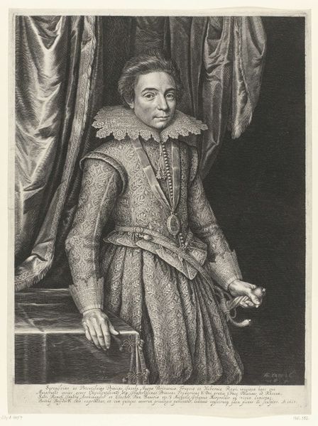 Pieter Soutman created this engraving of Magdalena Moons as part of his series "Quatuor Personae." The print's composition is structured around the contrast between the figure of Magdalena Moons and the background elements. The sharp, detailed lines defining her dress and features create a striking visual texture, set against the softer, more diffused lines of the distant city. The portrait's formal arrangement and the play of light and shadow emphasize the sitter's social status, which in turn evokes power. The artist uses a visual language of dress and setting to engage with ideas of identity, social class and historical narratives. Consider how the artist invites us to contemplate the interplay between representation and reality and to engage in a continuous process of interpreting the past.