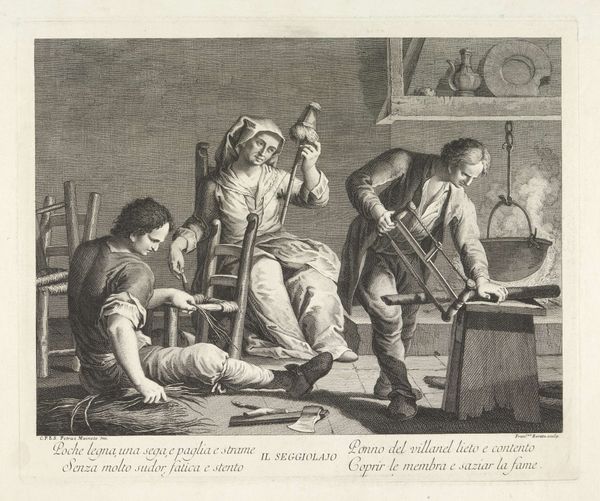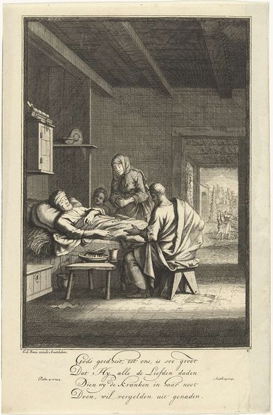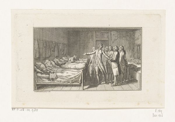 Editor: This engraving, "Testament van Eudamidas," made sometime between 1633 and 1700, by Jean Pesne and held at the Rijksmuseum, strikes me as a very still and solemn depiction of someone's final moments. The people around the dying man seem overwhelmed with grief. What symbolic elements are at play here, if any? Curator: It is a deeply moving scene, isn’t it? Let's consider the shield on the wall. What might that shield represent to you? Perhaps protection, honor, or a life lived in service. Its presence near the deathbed adds another layer to the testament occurring; this man, likely a soldier, provides a final act of service by securing the well-being of the grieving women through his will. Note how his languid body contrasts with the purposeful activity of writing; what story do these actions evoke? Editor: That's interesting. The shield does suggest his service in life. And you are right, there's a real contrast in the scene. He's obviously passing away, but someone is actively writing. So it is more of an allegory, than an historic scene. The focus here is more on making sure those left behind are cared for. Curator: Precisely. Think of the persistent imagery across centuries. Testaments carry enormous weight, both legally and emotionally. Notice how Pesne uses light and shadow – the contrast creates a somber mood. In that mood the engraving invites reflection on mortality and social duty; have such concepts changed radically or remained the same in the centuries after Pesne? Editor: It seems some of these social obligations continue even today. I didn't realize engravings could be so layered with meaning. Curator: Every stroke is intentional, contributing to the symbolic narrative. I am pleased the iconography spoke to you. Editor: Thank you. It helped to have a guide to see the full scope of the images and story that is present.