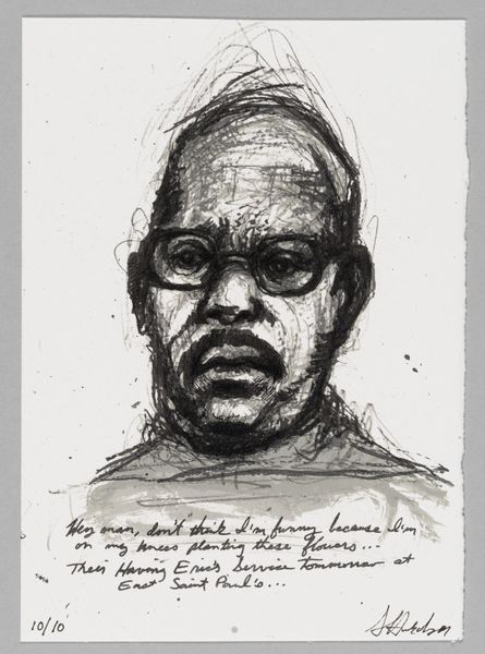 Editor: Here we have Sedrick Huckaby's "99% NO.25 Jerome," a powerful portrait with a lot of texture. The gaze is intense, almost confrontational. What do you see in this piece? Curator: The eyes draw me in, acting as windows to the soul. The sitter seems to carry generations of stories within them, echoing traditions of resilience and struggle, a visual memory of the past. Editor: That's a beautiful way to put it. I hadn’t considered the idea of inherited narratives. Curator: How does the artist's medium influence your interpretation of the narratives being passed down? Editor: I think the monochromatic palette gives it this sense of history, like an old photograph. It’s definitely something to ponder. Curator: Precisely! It becomes an exploration of personal and shared histories.