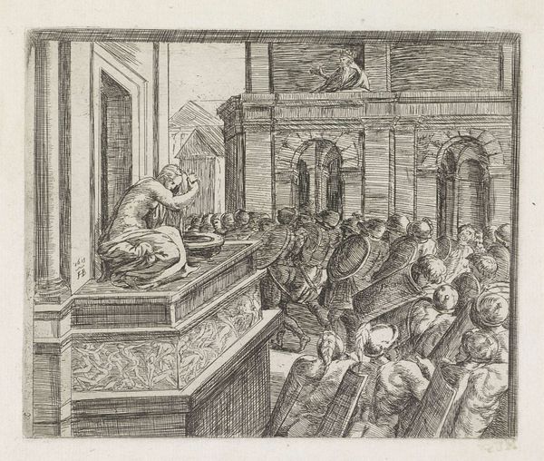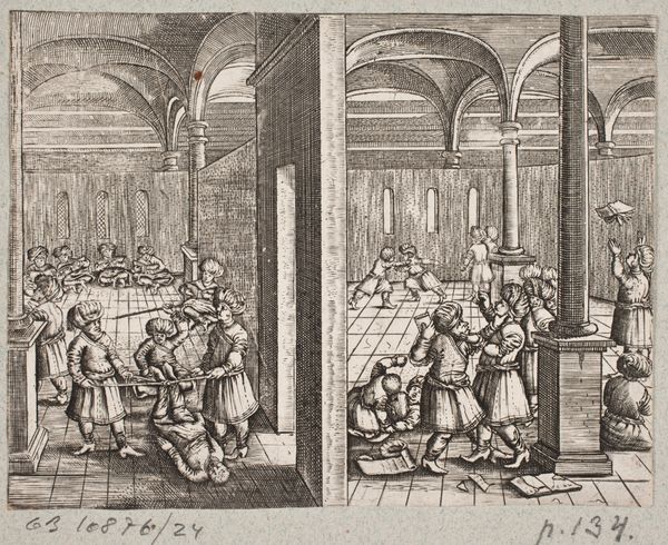 This engraving titled 'En madrassa?' presents a meticulously rendered scene of children at play within a grand, vaulted interior. The anonymous artist uses a dense network of fine lines to define forms and textures, creating a composition dominated by the stark contrast of light and shadow. The eye is drawn to the rhythmic repetition of arches and the strong verticals of the columns which divide the space, suggesting both order and a sense of enclosure. Yet, this architectural rigor is juxtaposed with the dynamic arrangement of figures, caught in moments of spirited activity. The artist employs a semiotic system of signs through dress and setting, inviting us to interpret the cultural codes at play. Ultimately, the engraving invites us to consider the relationship between structure and freedom, and the tension between the formal constraints of the architectural space and the spontaneous energy of childhood. This tension underscores the work's enduring power, as it invites multiple interpretations and reflections on the interplay between control and expression.