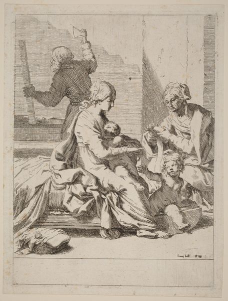 Editor: This engraving, "Flight into Egypt," made sometime between 1663 and 1743, depicts Mary, Joseph, and the infant Jesus escaping to Egypt. It’s attributed to Robert van Audenaerde. What strikes me is how vulnerable they appear, even with this seemingly divinely ordained protection. What can you tell me about its historical context? Curator: It's interesting that you note their vulnerability. Considering the Baroque period’s investment in dramatic narratives, that feeling might be intentional, fostering empathy in the viewer. Consider how this image was circulated. As a print, it’s more accessible than a painting. What impact might this have had on its reception and the spread of the story it tells? Editor: That’s a good point; its accessibility makes it potentially a powerful piece of religious propaganda, doesn’t it? Especially when literacy wasn't as widespread as today. The imagery becomes the message. Curator: Exactly. Prints like these often served as devotional aids, influencing public piety and shaping religious understanding. Notice how Mary is portrayed, almost collapsing under the weight of the child, the depiction of the divine taking on human suffering. Do you see how that contrasts with traditional portrayals of the Madonna? Editor: Yes, usually, we see her regal, enthroned almost. Here, she looks like any mother on the run, trying to protect her child. I'd not thought about art being employed for that kind of manipulation of religious ideas and beliefs, not explicitly. Curator: Precisely. So, thinking about the 'public role' of this 'art', how do you see such imagery fitting within broader societal power structures? Editor: I see it now: religious and political ideologies reinforcing each other. This work is much more than just an image, but a tool to indoctrinate the public. I’ll never see these engravings the same way again.