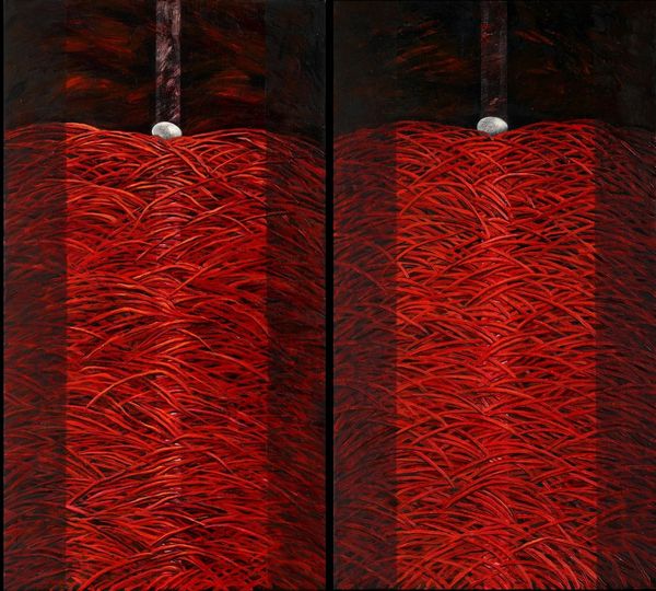 Editor: We're looking at Paulo Tercio's "Immaculate Conception" from 2014, made with acrylic paint. The stark contrast of red and black, the mirrored figures... it feels almost like a gothic altar piece. What are your thoughts on it? Curator: Immediately, the symbolism jumps out. The title itself, "Immaculate Conception," throws a sharp contrast against the stark, almost aggressively erotic imagery. Do you see the repeated crescent shapes? Think of the layers of meaning embedded within them. Editor: You mean the crescents that are also part of the figures’ torsos? The color creates an additional symbol in both locations... Curator: Exactly! Consider the crescent in its long association with femininity and the moon goddess Diana and its associations with ancient matriarchal systems. And that visceral red! Is it violence or passion? Or are these ultimately inseparable? Editor: That's fascinating. So the artist might be deliberately playing with this tension, challenging conventional religious iconography through... almost a primal lens? Curator: Precisely. Tercio might be digging into cultural memory, revealing how seemingly disparate symbols are inextricably linked. This artwork is both strikingly contemporary and rooted in millennia of symbolic thought. Notice, too, the fragmented, almost shattered forms – is this the deconstruction of a long-held myth? Editor: I hadn't considered the fragmented forms in that light. It feels much richer now. Curator: That’s what is incredible in Tercio's work; these icons stay potent, even as the structures around them fall apart. They remain to challenge viewers even when detached. Editor: This has really changed my perspective on the piece. The layers of symbolism are much more complex than I initially realized. Curator: And that is, perhaps, what makes a work truly worth contemplating, isn't it?
