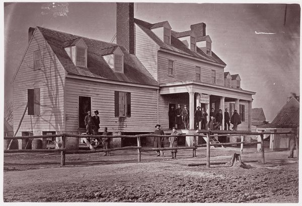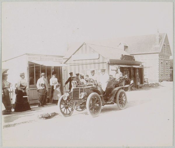 Curator: Welcome! Let’s consider this untitled photographic print, thought to be created sometime in the 19th century, and part of the Art Institute of Chicago's collection. Editor: It projects such a striking mood of quiet industry! The tonality is beautiful, full of subtly modulated greys. I see how the composition, dominated by rectilinear shapes—the store, the wagon—suggests an era defined by emerging structure. Curator: I'm intrigued by that. Note how "S.K. Fisk" is emblazoned above the shop entrance, establishing not just a place, but also an identity. Editor: Absolutely. “Fisk”, as in fish? Well, the symbol of the fish is quite rich—connected to early Christianity and symbolic abundance! Were they selling fish, perhaps? Or did Mr. Fisk align his enterprise with this culturally-loaded image? Curator: Perhaps a play on words. We do have a horse, motionless, tethered in service. A man, perhaps the delivery driver, sits perched atop the delivery wagon reading. It presents a tableau of the everyday—work, delivery, perhaps a stolen moment of literacy. Editor: The composition’s rigor gives it a particular potency, then. It isn't a random snapshot, but an organized visual declaration. The repeated verticals of the clapboard siding of the buildings and windows contrast with the curvilinear form of the horse and wheels of the delivery wagon, forming an intentional construction of social meaning. Curator: Quite possibly. The details are rich—the meticulously stacked packages on the wagon, the design of the wagon itself, the horse’s tack—they all contribute to this meticulous, almost obsessive rendering of reality. Editor: True, this close attention also transforms mundane objects into bearers of meaning. That wagon suddenly is not only transport; it’s a signifier of burgeoning commerce, of goods traveling to extend economic reach. The picture's impact exists because it organizes the familiar and transforms it. Curator: A stimulating interpretation! It prompts us to reconsider how much information can be embedded in an image, even a seemingly straightforward one. Editor: Indeed! It makes me consider the layered narratives a seemingly simple photograph like this contains—histories of labor, the emergence of industry and graphic design as commerce met vernacular symbol!