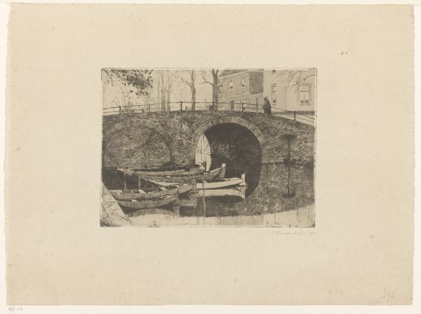 Curator: Let's discuss "Un pont boulevard Ney," a 1913 etching by Charles Heyman currently residing at the Minneapolis Institute of Art. My initial impression is somber; it has this beautiful network of urban structures rendered with such starkness and intricate detail, almost ghostly. Editor: Ah, a tangible cityscape conjured from thin air, almost oppressive in its geometric starkness and seemingly romantic gaze upon an evolving urban landscape, perfect example of modernity's discontents realized with material skill. One could say Heyman meticulously recorded not just what was there but how industrial encroachment felt. Curator: Precisely. The etching technique is key; the fine lines create a dense network, reflecting the subject matter. There's a palpable sense of the artist carefully working with the metal plate to reproduce this vision, but also the conditions and demands placed upon labor itself in capturing this urban view. It suggests more than meets the casual eye. Editor: And, tell me, where is it that this etching moves you beyond its materials? To me it evokes this peculiar feeling – a melancholy longing. Despite the harsh angularity, the subdued tonality softens the impact; as if trying to find beauty amid industry and chaos. It certainly captures a Parisian sentiment; fleeting and pensive while the city shifts forever around you. Curator: Indeed. You see in this the negotiation between industry and artistry—how social life seeps into creative expression within very particular spaces! Editor: Exactly, and considering that the cityscape has held relevance across ages for people, maybe this offers us something far simpler to reflect: we can create even through industrial materials a personal narrative for what’s considered, by some, to be ugly and uninspiring, making it meaningful and touching. Curator: Fascinating perspectives; perhaps there's an optimism lingering in the very act of artistic transcription amid shifting spaces? Editor: Or maybe it’s just etching reality and ourselves upon the blank plates of potential…until the plates inevitably wear and the edition comes to its end.