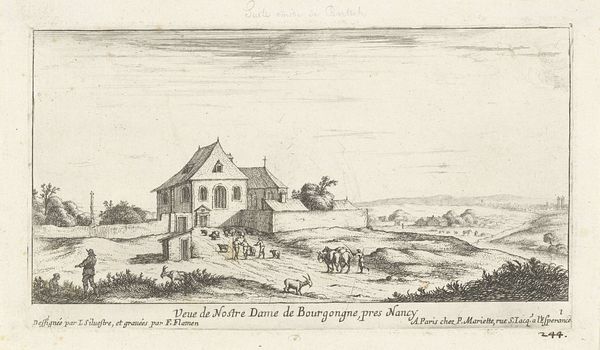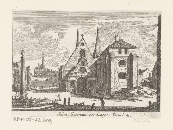 Curator: Here we have "View of the Gate of Saint George in Nancy," a work from 1650 by Israel Silvestre, held at the Rijksmuseum. It's an engraving, showcasing the Porte Saint-Georges. What strikes you about this image? Editor: Its scale is impressive, especially for an engraving. There's a stillness, almost staged. Despite the people milling about, it feels monumental and perhaps even a little foreboding. Is that connected to Nancy’s role in broader territorial conflicts? Curator: Very possibly. This gateway, depicted with such meticulous detail, served both a functional and symbolic purpose. Notice the architectural vocabulary, evoking the Baroque era—but perhaps signaling strength and power as well as ornate aesthetics? Think of its position as a city entrance and a defensive point. The symbolism is intertwined with its function as a site of control. Editor: Absolutely. And that ties into something deeper. What kind of narratives about authority were being constructed in France at this time? The gate becomes not just a point of entry but a stage for performing and solidifying power. Curator: That’s a key element of the image. The perspective and the detailed rendering invite the viewer to participate in this staging. And it draws the eye upward towards the figure on horseback. Beyond the gate itself, we're offered a glimpse into a much more idealized vision of hierarchy and civic space. Editor: I wonder how much the image reflects actual urban experience for marginalized populations in Nancy? We have all this focus on power, but that should push us to ask, who is conspicuously missing from the frame? Or who's relegated to the background noise of everyday life here? Curator: These questions really make us consider who gets to participate in these idealized visions. Editor: It prompts us to look closer. A monumental architectural symbol can tell as much about cultural memory as it tells about those who have been left out. It becomes about looking for the ghost presences. Thank you. Curator: Thank you, for underscoring the complexities embedded in these cityscapes. A seemingly straightforward view turns into an intricate landscape of social, political, and historical reflection.