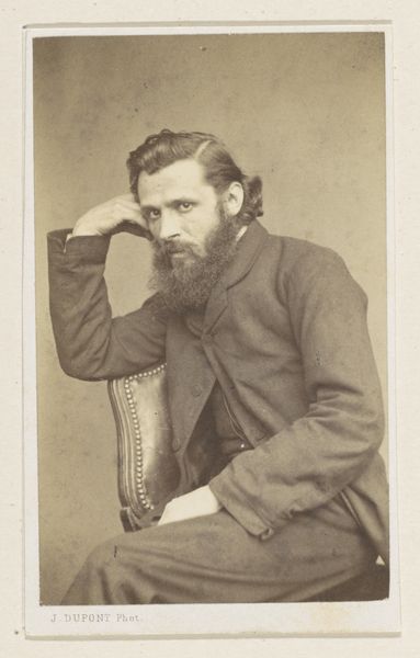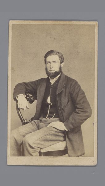 Curator: Here we have a photograph titled "Portret van de schilder Frans Vinck," taken in 1866. It's an albumen print, a very common process in the mid-19th century. What's your immediate impression? Editor: Well, he certainly looks self-assured. Arms crossed, a direct gaze... the beard practically dares you to challenge him. I’m getting a distinct "artist as confident creator" vibe. Curator: Exactly. Photography during this period was increasingly accessible to the middle class, and portraits like this offered a new way for individuals, including artists like Vinck, to present themselves to the public. He's deliberately projecting an image. Editor: I agree. That beard isn't just facial hair; it’s a symbol of his artistic persona. Think of the beards sported by pre-Raphaelite painters; a full beard denoted creativity, unconventionality, even a touch of the bohemian. Curator: The image is carefully constructed, despite its apparent simplicity. Vinck isn’t just posing; he's curating his own image. The neutral backdrop pushes the focus entirely onto him, solidifying this idea. What I wonder, though, is what part patronage played. How much of the artistic sphere at that time helped cultivate these images of artists? Editor: Well, one cannot forget that even now patronage is part of what the public see, for me I read into the background's subdued tones to highlight the individual. There's something timeless about it; the essence of the artist as an independent thinker is very effectively captured. The subtle clothing adds to this focus on what matters, not flash or grandeur but thoughtful creation, to a level you rarely saw after art became monetized to another level. Curator: I appreciate that perspective. Thinking about the broader social context of photographic portraits provides some additional layers here, seeing Vinck in line with the trajectory of the image of "the artist" throughout the era. Thank you for opening me to his presence, almost confronting. Editor: It has been a privilege, the confidence captured on that print resonates powerfully even now.