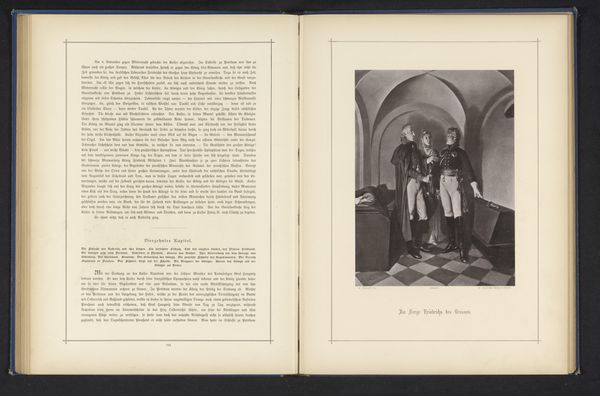 This is a photogravure reproducing a painting that stages the meeting between Louise of Prussia and Napoleon Bonaparte. Note how the composition is structured to emphasize the spatial dynamics of the scene. The figures are carefully positioned, Louise stands further back, creating a sense of distance between her and Napoleon, who is placed on the left. The rendering in grayscale flattens the tones. The effect serves to highlight the textures and forms of the interior, which adds depth to the scene. The artist uses the formal elements of composition, scale, and tone to explore historical power dynamics and the subtleties of interpersonal relations. The controlled palette invites us to consider how visual techniques can be used to construct meaning within a historical narrative. This is a reminder that art is always mediated through the lens of representation and interpretation.