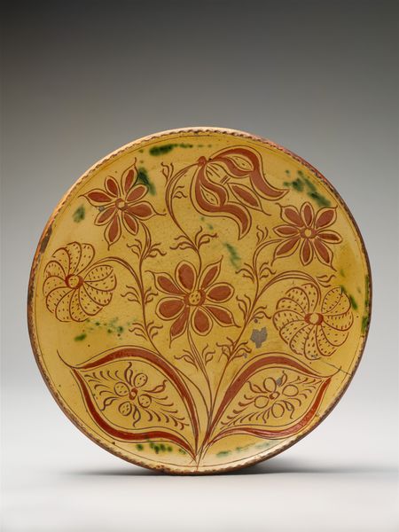 Editor: So, this is an earthenware plate from 1830, attributed to John Monday. The colorful, folk-art design really jumps out – it’s charming! The painted flowers give it a lively feel, despite being on a rather humble material. What do you make of it? Curator: This piece exemplifies the democratization of art through readily available materials and the labor of artisans. The ceramic, while functional, is elevated through its painted decoration, blurring the lines between craft and fine art. Consider the social context: was this mass produced, or uniquely hand-painted? Editor: I see. It definitely looks hand-painted, you can see the individual brushstrokes, particularly in the flower details. And, you’re right, was this something affordable available to a large portion of the population, or something commissioned and a marker of status? Curator: Precisely! The choice of earthenware, the painting style—all point to the economic realities of the time. We should consider where John Monday was based, what trade networks he had access to, and how these materials shaped his artistic expression. Editor: It’s amazing how much we can glean from simply considering the materials and production process. I’d never thought about decorative objects like this in terms of labor before. Curator: These “simple” objects often hold more complex histories related to skill, access, and social value than more celebrated artworks. Editor: This plate really makes you think about art existing outside of museums and galleries. Everyday life aesthetics, like folk art, tell a unique story. Curator: Exactly, art within the reach of everyone, shaping lives and culture on an everyday scale. Thinking materially truly grounds art within history.