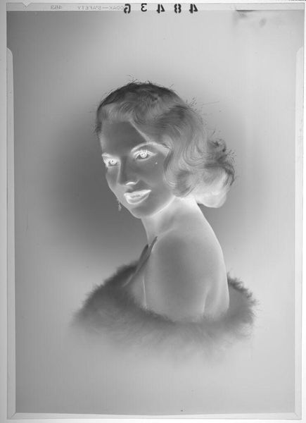 Editor: This is John Howell's "Untitled (young woman in graduation portrait)" from the Harvard Art Museums. It's a photographic negative, so it's all inverted. What symbols stand out to you in this image? Curator: The inverted image itself carries weight. Consider the symbolic significance of a graduation portrait, a rite of passage. Now invert it. Does it evoke a sense of unease or reveal a hidden truth beneath the surface? What emotions might that inversion spark? Editor: That’s a fascinating point about the inversion creating a sense of unease. I hadn't considered that. Curator: The inversion reminds us that symbols can be subverted to challenge societal norms or to provoke new interpretations. Seeing this image differently helps us understand how our perceptions are shaped. Editor: I agree, it is a good reminder to challenge our assumptions. Thank you!