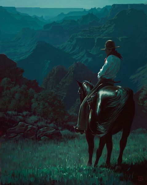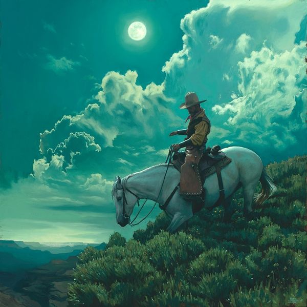 Editor: Here we have Mark Maggiori’s “Riders of the Coyote Moon” from 2019. The whole scene is bathed in moonlight, and those huge clouds loom dramatically over the two riders. There's something really striking about the romanticism, and almost theatrical mood. What's your take on this piece? Curator: It's interesting you pick up on the theatricality. I see it too. This work engages a complicated mythology of the American West that has been shaped and reshaped by popular media: film, literature, and, before those, dime novels and Wild West shows. Maggiori is contributing to, but also commenting on, that legacy. Think about the power of the Western as a globally consumed genre – what does it signify? What does it mean to represent these figures in 2019, when Maggiori created this painting? Editor: So, it's more than just a scene of cowboys riding under the moon? Is it meant to reference earlier artwork? Curator: Definitely. The composition and the lighting, that theatrical moonlight you mentioned, calls to mind earlier painters of the West like Frederic Remington. But the staging feels almost… manufactured, doesn't it? Are these cowboys, or are they actors playing cowboys? And what stories are we meant to associate them with? Consider who *gets* to play the cowboy—who has been written *out* of this historical role through artistic portrayals? How might this image uphold—or challenge—that narrative? Editor: That's given me a lot to think about. I was drawn in by the visual drama, but now I'm seeing how much it plays with the established iconography of the West. Curator: Exactly. It invites us to unpack the history and the power dynamics embedded within seemingly straightforward images. Thanks for helping me notice how relevant this artwork can be when considering identity, stereotypes, and who has power over historical representation.