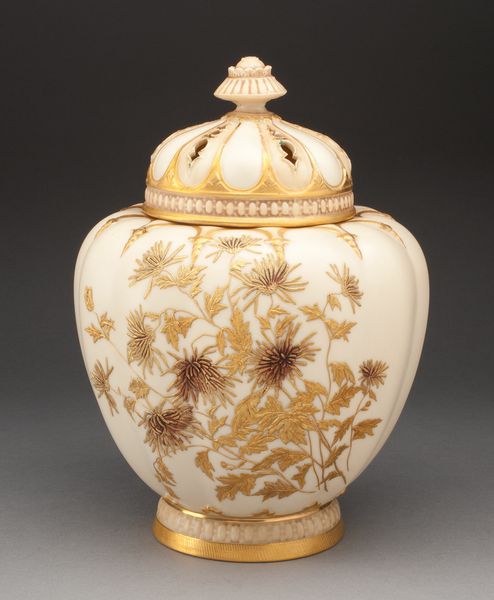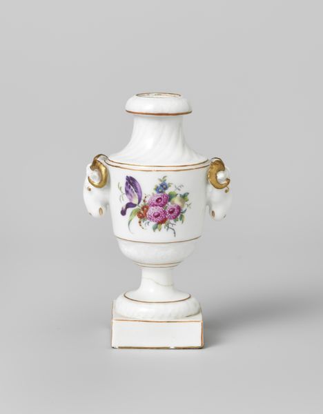 Editor: So, here we have a "Vaas met bloemversiering," or "Vase with Floral Decoration," made somewhere between 1880 and 1920 by De Porceleijne Fles. It's earthenware with a painted floral design. The colors are so delicate, pale greens and yellows. What do you see in its design? Curator: Focusing purely on the formal qualities, note the carefully considered proportions of the piece. The spherical body supports a neck punctuated by repeating, geometric shapes. The chromatic range, predominantly pastel, underscores the object's overall sense of balance and refinement. Editor: It strikes me that the decoration seems intentionally simple, almost naive. It doesn’t seem to aim for realism. Curator: Indeed. The floral motifs are stylized rather than naturalistic. Consider the lines – the dark outlines that delineate each petal. These graphic contours assert the two-dimensionality of the decoration. The very act of applying paint to the earthenware transforms a functional object into an exercise in form and line. Editor: Do you think this emphasis on shape and line moves it away from being simply decorative? Curator: Precisely. The careful distribution of floral elements across the vase's surface engages with fundamental principles of design. The strategically placed, larger blooms draw the eye, while smaller details serve as counterpoints, creating a dynamic visual rhythm. Editor: It’s funny, I initially just saw it as a pretty vase. Now I see it as a careful study in composition and form. Curator: By engaging with the formal elements of the piece, we are able to see the visual interplay as a considered arrangement, not a random assortment of flowers.