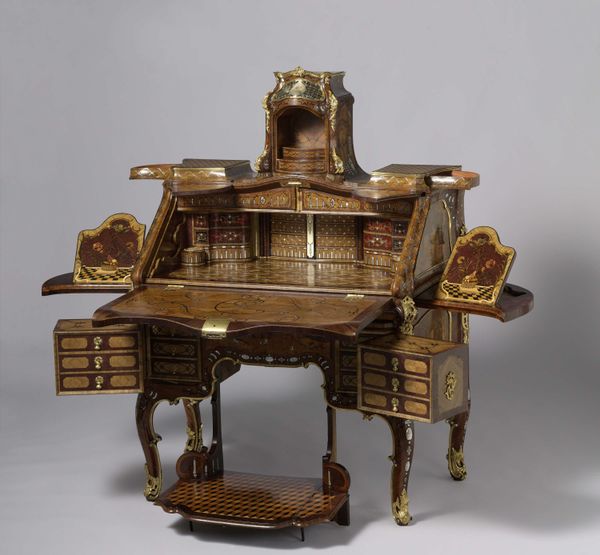 Curator: At first glance, it feels like a prop from a dream sequence—strangely familiar, yet completely bizarre. Editor: Indeed. What we have here is "Collector's Cabinet and Chair," a mixed-media piece created by Carlo Bugatti between 1885 and 1890. This fusion of sculpture, furniture, and decorative art can be found right here at the Minneapolis Institute of Art. Bugatti employs various materials, including wood and metal. The construction is very intentional. Curator: "Intentional" is an understatement! Those tassels, the spindles reaching skyward...it’s like he's trying to invent a new visual language! The object is strangely ornamental! And are those little paintings of like…mushrooms near the base? This furniture almost mocks the very idea of function. It looks precious in ways that other furniture usually isn’t. Editor: You're right—functionality isn't exactly paramount here. It certainly borders on the avant-garde! However, consider the stylistic elements at play. Note the Art Nouveau curves tempered with Orientalist motifs, referencing North Africa and Japan—a common artistic trend in Europe at this time. Think of the piece as a dialogue, an almost unruly conversation between Western design principles and Eastern aesthetics. And observe the various forms. Circular forms give way to stark geometry and then soft embellishments like tassels—almost a fractal of shapes working as an aesthetic of excess! Curator: I see it… the “conversation” you describe is wonderfully clunky! Each visual idea almost colliding with the others. I get the sense that Bugatti reveled in these types of unexpected pairings and textures. The artist seems to be aiming for something beyond the conventions of good taste! Editor: Perhaps "taste" is precisely what Bugatti challenges. By playing with form and structure so directly—we find something else, like a deliberate, self-conscious departure. Curator: Makes one wonder, what does it hold? What kind of treasures does such a peculiar display deserve to hold within? I suppose it's a riddle only the collector knows. Editor: A perfect assessment. We have approached Carlo Bugatti’s curious construction from different yet intersecting angles, both recognizing its place within its time, but also as an interesting divergence.