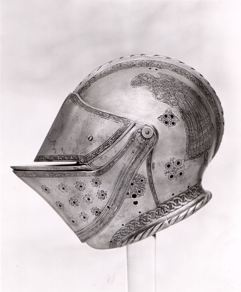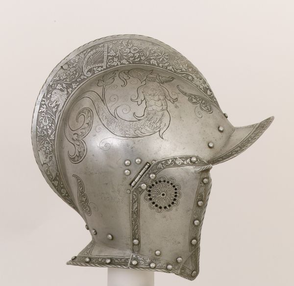 Curator: This gleaming piece is a "Close Helmet for a Boy," crafted sometime between 1505 and 1565, likely by the German armorer Kolman Helmschmid. What catches your eye about it? Editor: Immediately, it feels…small. There's an almost poignant contrast between the intense craftsmanship and the helmet’s diminutive size. Makes you wonder about the boy who would’ve worn it, off to play his own peculiar war games. Curator: Exactly! The size is deceptive, isn’t it? Yet the meticulous details—the etched bands, the tiny perforations, and the carefully designed visor—demonstrate considerable skill and artistry. We must also acknowledge that we view it today separated from its whole armor, the impact of that is notable. Editor: Absolutely, taking into account that helmets from our time prioritize impact and ergonomics, I cannot but help and appreciate the elaborate patterns which appear designed just for show. Almost performative in nature, don’t you think? All those swirling lines create such visual texture across the smooth metal surface. Curator: They certainly were status symbols, even children's armor. These weren't simply protective devices; they spoke volumes about family wealth and position. Helmschmid, we believe, created pieces for nobility and aristocracy. Imagine the kind of life this young wearer would have been prepared for? Editor: Quite. Although the purpose it had during those ages are evident, in modern day it represents a poignant reminder of our strange fixation on protection, status, and performance from our past. Curator: Indeed. The formal beauty and underlying history create a strange dichotomy that has you both admiring its making as well as its underlying context and origins. Editor: Exactly, almost dreamlike in terms of symbolism, especially that one about an era gone by, almost alien. Curator: It's funny how something so physically robust can trigger such soft, reflective thoughts.