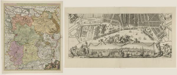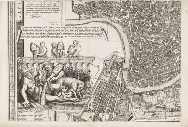 Curator: This is Matthäus Greuter’s “Map of Rome. Upper left part,” an engraving dating back to 1634. What strikes you about it initially? Editor: The density is incredible! It’s like a spiderweb made of buildings, all rendered with such intricate detail. There’s something imposing about its meticulousness. It definitely communicates power through organization, doesn't it? Curator: Indeed. City maps in this era were far more than geographical tools; they served as potent statements of authority and urban planning. Notice the allegorical figures flanking the top left corner – representations of justice and perhaps civic virtue? It certainly seems intended as a proclamation. Editor: Exactly! And that coat of arms positioned above them…whose is it? It adds another layer, hinting at the patronage or ruling power connected to Rome during that time. It’s not just a map, but a heavily encoded representation of political and social order. I can only imagine the resources required to put something like this together, and that labor is surely something to consider. Curator: Absolutely. And we see those socio-political considerations reflected directly within the structure of the map itself. Observe how the artist has chosen to represent the spaces occupied by various religious orders, landowners, and other wealthy and influential Roman families and individuals of that era. Editor: The level of detail emphasizes their importance within the societal fabric, almost acting as an advertisement. It definitely invites me to consider who benefited most from this representation. Was it for Rome's citizens or Rome’s power brokers, both secular and religious? Curator: Likely, it served both purposes. Maps like this were powerful visual propaganda, intended to inspire a sense of awe and stability. It showcases the glory of Rome, but from a specific perspective that reaffirms existing social and political hierarchies. Editor: Right. It really makes you question the power dynamics inherent in even the seemingly objective representation of a space. I appreciate seeing how something that appears purely informational can also serve to solidify a certain status quo. Curator: That's what makes historical artifacts like these so compelling, isn't it? It's in these seemingly straightforward images that we find the most telling cultural and social artifacts. Editor: Agreed. Seeing Rome laid out like this invites consideration for those written out of it as well.