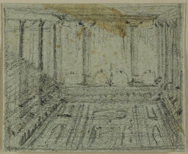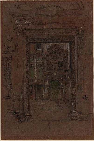 Curator: Welcome. We’re standing before Aleksandr Borodin’s "Architectural Phantasy II" from 2004, a mixed-media drawing employing oil paint and watercolor techniques. Editor: It feels like looking through a series of ancient doorways, one leading into the next, with figures emerging from the walls themselves. Curator: The layered arches suggest historical depths. Each portal is distinct, realized using varying materials and hinting at architectural evolution across time. Think about the Renaissance influence but reinterpreted through a modern lens, consider its socio-political implications in post-Soviet art. Editor: I’m intrigued by the textural contrasts. The rough, almost crumbling surfaces versus the smooth application of the watercolor. It speaks to the laborious process, perhaps referencing the constant rebuilding and re-evaluation of cultural narratives? Curator: Precisely. Borodin uses these contrasts to subtly challenge our understanding of time and history. Notice how the geometric forms are interspersed with organic, almost figurative details, the use of perspective to invite us into the imaginary structure. The very medium challenges traditional genres of cityscapes and portraits by inviting interiority. Editor: It seems also relevant that the material qualities here – oil paint, watercolor, the textures – stand against the subject of enduring architecture, highlighting that materiality ages even as aspirations endure. Curator: Absolutely. Borodin plays with that tension. He invites us to consider how artistic practices reflect societal shifts and individual identity within the vast scope of historical events. Editor: Thank you, it’s a perspective that elevates the piece beyond mere representation and makes us contemplate the interplay between material, labor, and our cultural constructs. Curator: A worthwhile connection to be made when observing artwork with historical perspectives and contextual consideration of material usage.