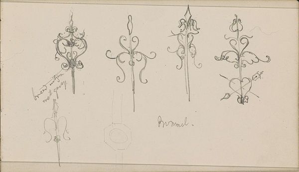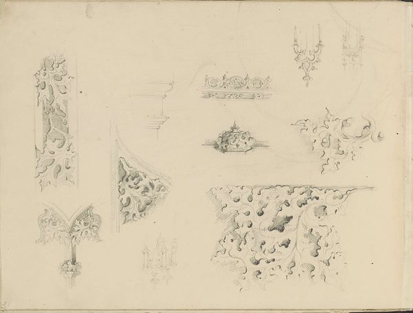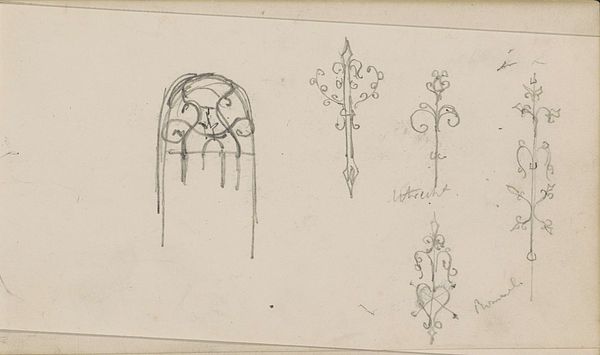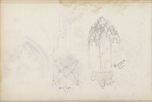 This page of studies exploring Gothic architecture, ornament, and cartouches was rendered in pencil by Pierre Joseph Hubert Cuypers. The motifs reflect a fascination with Gothic forms, a style that itself harks back to the medieval period. The pointed arches, elaborate tracery, and delicate floral patterns carry echoes of soaring cathedrals and illuminated manuscripts. We can see a similar impulse in the Renaissance's revival of classical forms, revealing a deep-seated human desire to reconnect with idealized pasts. Consider the cartouche: a decorative frame, often oval or shield-shaped, used to hold inscriptions or heraldic devices. The cartouche has roots in ancient Egypt, where it enclosed royal names, signifying protection and divine authority. It later reappears throughout Western art, evolving from a symbol of power to a decorative element. These Gothic symbols, charged with historical and cultural weight, awaken in us a profound connection to the past, resonating within our collective memory.