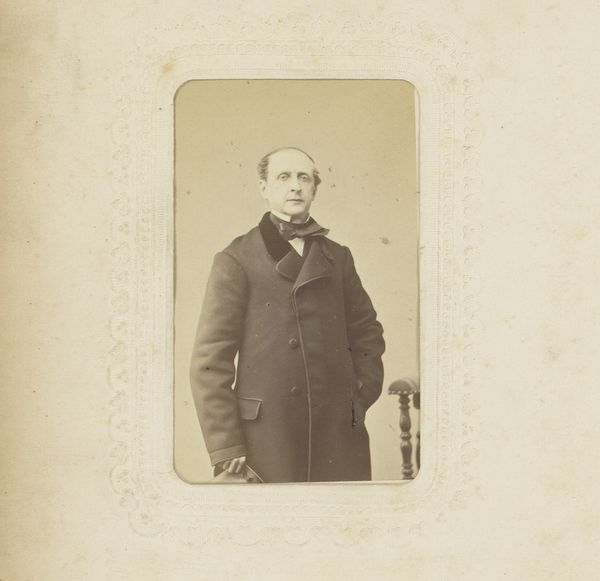 Editor: So, here we have a gelatin-silver print from around 1866, attributed to Jacob Hohmann. It’s a portrait, formally titled "Portret van een man staand bij een stoel, aangeduid als Ringers" - that translates to, "Portrait of a man standing by a chair, referred to as Ringers." My first impression is…stately. Maybe even a little melancholic? What do you see? Curator: Melancholic is a wonderful way to put it! I feel that too. But look closer, doesn’t it also strike you as… theatrical? The way he leans, the ornately carved chair – almost like a prop. And it really speaks to how photography, still quite novel then, was consciously mimicking the visual language of painting and theater to legitimise itself as an art form. It's not *just* a photograph, it's a performance, a construction. Makes you wonder, doesn’t it, who *is* Ringers? Editor: It does make me wonder! It feels like he’s trying to project an image of himself. Curator: Exactly! And the greyscale! Consider the almost unbearable limitations the lack of colour imposed upon the photographer - yet see the textures! The felt of the jacket, the dull gleam of his hair! What *couldn't* be, enhances what *is*. Editor: That's fascinating; I hadn't thought about the colour limitations as an enhancement, only as a limit! The textures really do jump out. It's funny how constraints can spark creativity, isn’t it? Curator: It's almost *always* the case. Every limitation holds a universe of freedom, when perceived the right way. A wonderful opportunity for us all, if you ask me! Editor: Absolutely, seeing this photo with your perspective has shifted how I look at early photography! Curator: And seeing it with your eyes makes *me* reflect anew on the magic in it. Always so rewarding!