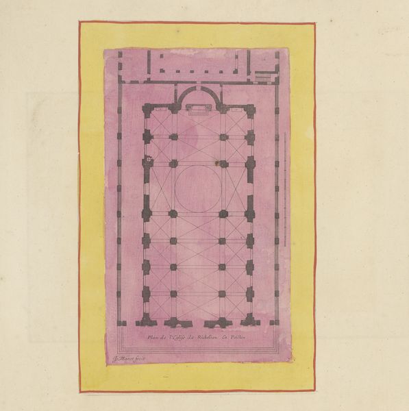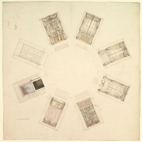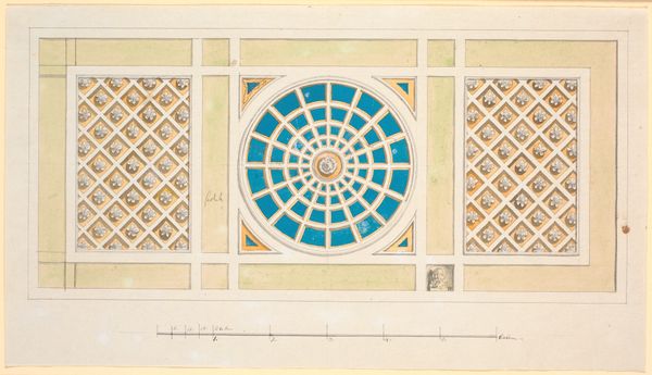 Curator: Immediately, I notice the delicate grid pattern dominating the composition. There's an airy quality to it. Editor: We are looking at "Partial design for ceiling with a border of flowers," an interesting print crafted sometime between 1830 and 1897 by Jules-Edmond-Charles Lachaise. It's held at the Metropolitan Museum of Art. What sociopolitical context do you think this piece might speak to? Curator: I'm drawn to the precision of the lines and the contrast to the organic floral border, particularly how it exists in relation to ideas around class and societal expectations around ornamentation. Editor: Precisely, this could definitely be positioned as a form of architectural planning from a time of significant social transformation. The use of watercolor gives the print a somewhat ephemeral feel. Semiotically speaking, this makes the art accessible because it also uses toned and homemade papers which allow the piece to be less rigidly ‘professional’. Curator: What interests me, also, is how such an architectural plan has flowers: flowers are symbols and gendered objects and in that capacity allow an insight into design beyond simple space and function. The delicate rendering of these blooms around the edges, does not remove the industrial element but certainly transforms it. How much did he engage, I wonder, with the feminine expectation that form follows function. Editor: Indeed. There is a push and pull that reminds me about a dialectical discussion about what a design space entails. If one examines the floral aspects closely, one will see that they lack an aggressive stance, it seems to show more submission instead. What philosophy may be drawn on, you think, with this observation? Curator: It makes one consider the Victorian emphasis on floral symbolism and how that filtered into design. I'd be fascinated to see what impact the societal codes for respect and beauty, and associated politics had on this specific print. We must recognize this goes against much of Modern art and how we discuss spaces for design. Editor: So, ultimately, what does Lachaise ask us? To reconsider our engagement to beauty when building and designing. An excellent proposal from such old, and therefore historical, printing design. Curator: It underscores, ultimately, how art continues to negotiate evolving expectations of living and identity.