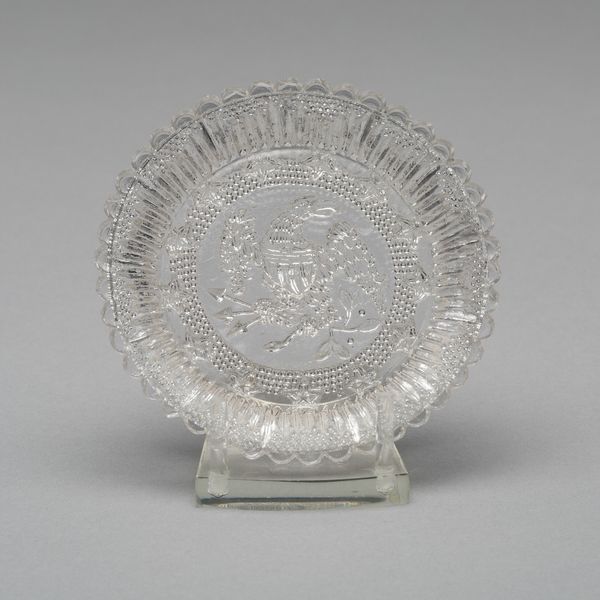Editor: Here we have an intriguing cup plate, likely crafted around 1840 by an anonymous maker. The material, pressed glass, is delicate, and it is currently part of the Art Institute of Chicago's collection. The image is centered around what looks like a humble cabin...what historical narrative or cultural meaning do you see embedded within this seemingly simple piece? Curator: The log cabin! Instantly recognizable as a potent symbol. What does a log cabin suggest to you? It’s interesting that it’s also surrounded by the words, "Tippecanoe" and "W.H. Harrison." Editor: To me, a log cabin represents a certain idea of American self-reliance and rustic simplicity... but the link to Harrison has me curious. It adds a layer of political identity I wasn't expecting. Curator: Exactly. The cabin wasn't just shelter. In 1840, it was a key campaign symbol for William Henry Harrison, running for president. This object taps into the "log cabin myth," a deliberate attempt to portray Harrison as a man of the people, despite his privileged background. How do you think this symbolic use impacted the common voter? Editor: By using the image of a humble home, perhaps people were meant to draw comparisons between their everyday lives and the candidate, and also be inspired by that humble start? Is that something he himself cultivated? Curator: Absolutely. And it worked! Even though he lived in a grand house, associating him with the log cabin resonated deeply. This cup plate isn't just a functional object, but a potent piece of political propaganda, embedding cultural memory in everyday life. Does it shift your understanding to consider the glass itself almost secondary to the imprint? Editor: Definitely, it changes how I see it. It speaks to how objects, even everyday ones, can carry powerful political messages and reinforce specific cultural narratives. This plate feels deceptively simple, yet it is really loaded with symbolic intention and meaning. Curator: Precisely. The artistry here is in the clever manipulation of symbols, revealing the profound influence of imagery on shaping political identity and public perception.
