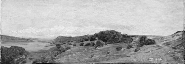 Curator: Gazing at "Landscape with Hills," brought to us by Lorenz Frølich between 1853 and 1857, my breath sort of catches. Doesn't it feel like standing on the edge of something wild and free? Editor: There's a stillness, too. The composition, predominantly horizontal, emphasizes the land's extensiveness, while the tonal range focuses our attention on the intricate textures defining each spatial plane. The marks really describe these material shifts well. Curator: Absolutely! It's done in graphite, plein-air and on paper, so there is almost an immediacy of capture...I'm picturing him, perched somewhere with his pad, battling the breeze, you know? But this also lands into a broader stroke of Romantic landscape sensibilities—nature is sublime. Editor: Yes, I do detect both Realist and Romantic aesthetics interplaying here. In structural terms, the work orchestrates a sophisticated semiotic field—those rolling hills layered against the horizon, act as potent symbols of the untamed yet perceivable world. Curator: Okay, slow down! But in a simpler read, those hills, that sketchy treatment, remind me of childhood storybooks, maps leading to buried pirate gold! Silly maybe, but Frølich speaks to something deep inside, that yearning for exploration. Editor: The tonal variation itself generates spatial logic; denser, shadowed graphite signifies proximity, whilst lighter, finer applications indicate depth. We decode perspective not just through the subject matter, but by means of contrast, creating an affective distance. Curator: Right, right, the how totally shapes the what. So beyond being just pretty scenery, do you think he was commenting on humanity's place in the grand scheme of things? Like, "Hey, we're small but kinda important, too?" Editor: He's definitely meditating upon existence, reflecting cultural desires to portray the self against the background of a wider terrain. He employs subtle cues; we must engage and unravel those relationships of self/environment in pursuit of knowledge, emotional clarity, and truth. Curator: Profound! I like how this little drawing is anything but small in spirit. Editor: Precisely, offering both visual pleasure and substantial critical insight, rendering Frølich a quietly monumental figure.