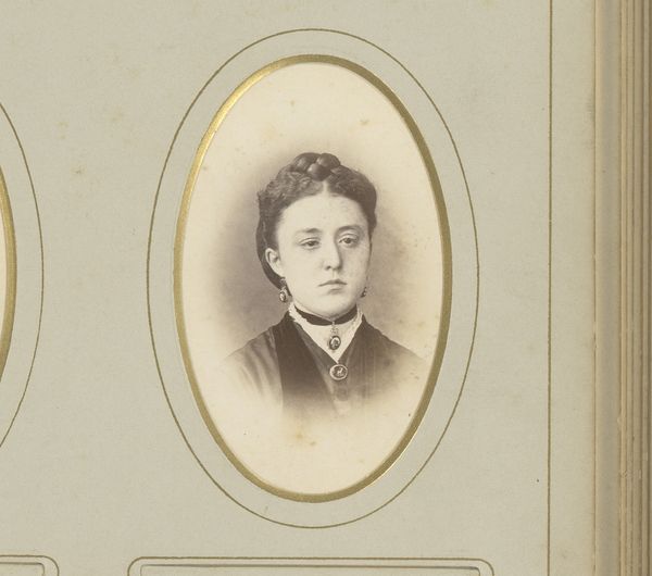This is a portrait of a woman with a bow in her hair by Palmer Descamps. It was likely made during the late 19th century, a time when photography was becoming more accessible, yet portraiture remained a formal affair, particularly for women. The woman’s attire and demeanor speak to the conventions of the era; her hair neatly arranged, her dress modest. However, there's a quiet strength in her gaze. It is a subtle assertion of self amid societal expectations. Descamps, as the photographer, plays a role in shaping this representation. His choices in composition and lighting contribute to the narrative, walking a line between personal expression and societal expectations of how women should be seen. The small scale and intimate framing draw us in, inviting a sense of connection. Consider the layers of identity at play here, both for the subject and the artist. The photograph becomes a space where personal identity and social roles negotiate. It gently invites us to reflect on the complexities of womanhood during this era.