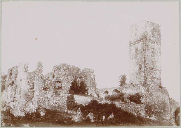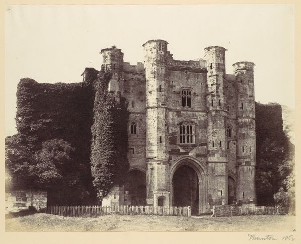 Editor: So, this gelatin silver print is called "Ruïne van Raglan Castle te Monmouthshire," taken by Francis Bedford sometime before 1862. The crumbling architecture has such a melancholic feel, don't you think? What stands out to you when you look at it? Curator: The ruin, cloaked in ivy, whispers of time's relentless march. Do you see how the natural world embraces the man-made, almost reclaiming it? It evokes a potent symbol, one loaded with cultural memory, really, particularly in Victorian England. Editor: A symbol of what, exactly? Curator: Transience, certainly. But also the Romantic fascination with the past, with nature's power to overcome even the grandest of human creations. The ruin, so artfully composed by Bedford, becomes a meditation on mortality, decline, and the sublime force of nature. Even that figure sitting in the doorway, almost disappears, like a ghost. Editor: So the castle isn't just a backdrop. It’s more like… a reminder? A symbolic representation of bigger ideas? Curator: Precisely. Photography, at this time, sought to capture not just surface reality but deeper, emotional truths. The ruin carries echoes of bygone eras, reminding us of lost glories and inevitable decay, a visual *memento mori.* Editor: I never considered photography in that light before. It makes you wonder what symbols we're building into images today, even without realizing it. Curator: Indeed. We all participate in encoding images, often unconsciously, with the emotional, cultural, and psychological weight of our own time. Seeing it expressed so beautifully here helps unlock that process.