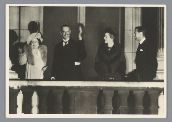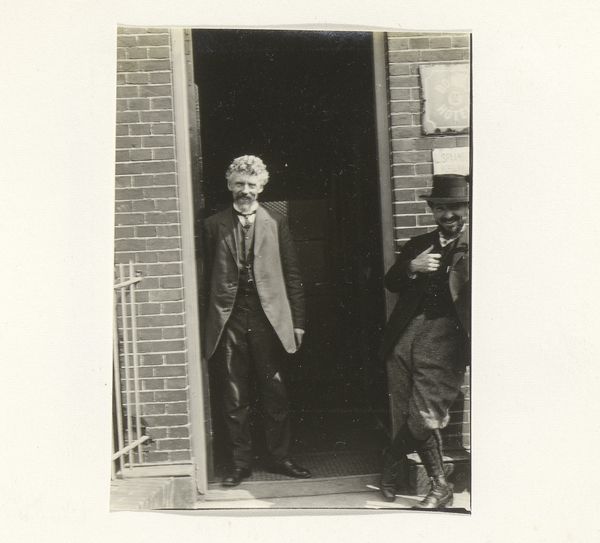 Curator: This photograph, entitled "Mannen en vrouwen bij een deuropening," which roughly translates to "Men and Women at a Doorway," dates from around 1900 to 1910. It is a gelatin-silver print. Editor: It's striking, isn’t it? Very somber. They all seem so serious, especially that central figure clutching something dark in his hand—perhaps a camera or other equipment? There’s a formality here that speaks to an era. Curator: Absolutely. Thinking about it as a gelatin-silver print helps us consider the layers of labor involved. It's not just the moment captured, but the skilled darkroom work that gives it this particular tone and permanence. The process of creating and fixing this image would have been quite involved. Editor: It also raises questions about who this group is and what they represent. The photographic format was becoming more accessible then, but who commissioned it, and for what purpose? A family portrait, perhaps? The door itself looks to me as if is part of the architectural feature on a government building. What statement might that convey? Curator: It’s an interesting question, considering the emerging social function of photography in that period, that intersection of amateur and professional, public and private. And their attire, look at how it’s designed! The subtle variations and, most importantly, what the creation process entailed for people. These materials represent far more than just adornment; they embody an entire labor system, don't they? Editor: Precisely. How were such portraits circulated, displayed, and valued? Was this intended as art, documentation, or both? It appears that there were several successful, early twentieth century movements employing photography and photographic aesthetics that were invested in similar questions about form and presentation as fine art. That’s a piece that adds so many potential layers of analysis. Curator: This photograph certainly illuminates the craftsmanship and material processes that define an era, revealing the socio-economic context through which this group sought to be seen. Editor: Agreed, and by understanding that broader context we can start to unearth hidden narratives and explore the dynamic relationship between the artwork, its creators, and its audience.