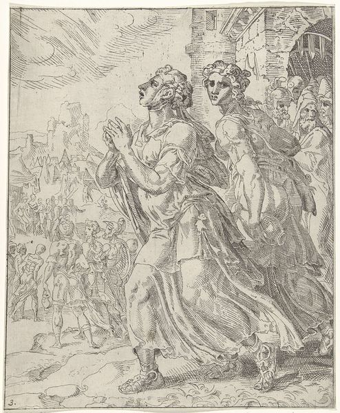 Editor: This is Aertgen Claesz. van Leyden's "The Meeting of Abraham and Melchizedek," a pen and ink drawing on paper from around 1525 to 1530. The detail is striking for what looks like a sketch, particularly the textures created by the varying ink washes. What stands out to you in terms of the materials and construction? Curator: It's crucial to recognize the context: drawings like this weren't always considered autonomous artworks. The paper itself, and the ink, point to a specific kind of craft production. Look at the precision, it was likely conceived within a workshop setting, potentially as preparation for a larger work, like a print or panel painting. Do you notice the clear depiction of those wheeled carts in the background? Editor: Yes, they're very detailed. They add to the overall sense of narrative and movement. Curator: Exactly. The artist meticulously rendered these everyday objects alongside the figures. This elevates the status of the quotidian, incorporating labor and transit into the sacred narrative. Think about the economics of producing and moving those supplies, compared to commissioning religious art. Editor: So, by highlighting those usually unseen aspects, Van Leyden’s changing our perception of religious art? Curator: Precisely! The very act of committing this scene to paper and ink implicates both artist and patron in a material exchange. They're participating in the production and consumption of meaning through both labor and devotion. What happens to our understanding of Abraham and Melchizedek when they are placed on the same level with wheeled carts? Editor: That gives me a lot to think about. I was originally focused on the biblical scene, but the attention to materials and production adds another dimension to understanding its value and message. Curator: And that attention reminds us of the society that produced, consumed, and found meaning in its art.
