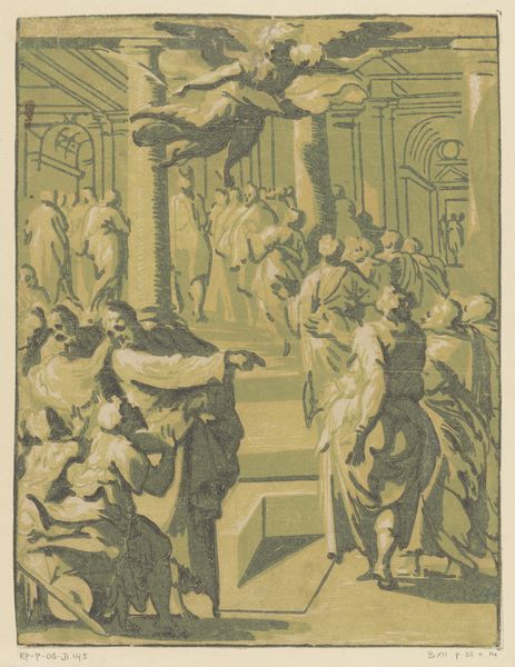 Editor: This is Niccolò Vicentino's "Christ healing the paralytic," a print dating back to the mid-16th century. The limited palette really concentrates my attention on the dramatic gestures and crowded composition. What strikes you when you look at this print? Curator: The density of the imagery speaks volumes. Consider how the artist uses the angel figure hovering above – a visual shorthand for divine intervention, but also a potent symbol, isn't it? Its presence changes the spatial dynamic of the scene by inviting viewers to think about divine forces acting upon the earthly realm, wouldn't you say? Editor: Yes, it makes the miraculous act almost tangible. I'm curious, how would people from that era understand it? Curator: In the Renaissance, viewers were acutely aware of biblical narratives, yes, but they would've also instantly grasped the architectural symbolism. Think of the temple, it wasn't simply a location but a symbol of order and authority, contrasted with the paralytic’s physical brokenness. Where would you see this conflict represented now, in today's art world? Editor: That contrast really highlights the disruptive power of faith, right? I mean, to heal defies order in a way. Maybe contemporary art questioning societal norms is kind of similar? Curator: An interesting parallel! The symbolism surrounding faith and authority transcends time, wouldn’t you agree? How different mediums – from Renaissance prints to contemporary installations – portray enduring themes of healing and societal order is something to keep pondering, yes? Editor: Definitely. It makes me appreciate the layered meanings woven into a single image. Curator: Indeed. By recognizing symbolic languages from history we enhance our awareness about cultural memory and societal continuity and we perceive psychological needs and emotional power across centuries, what a rewarding learning experience!