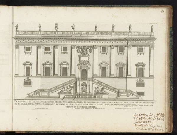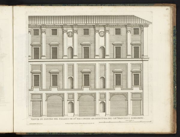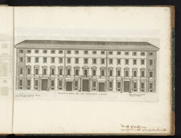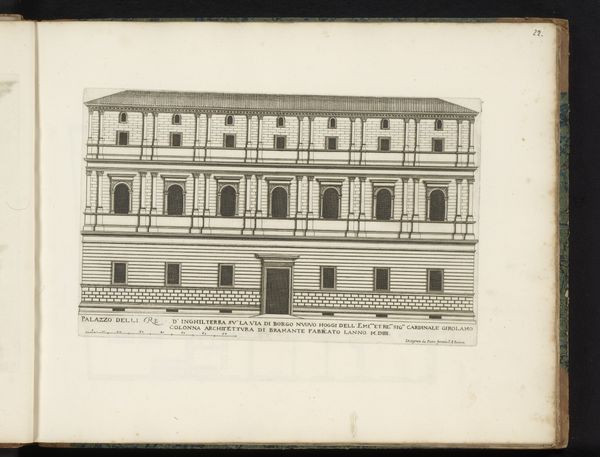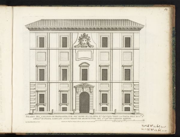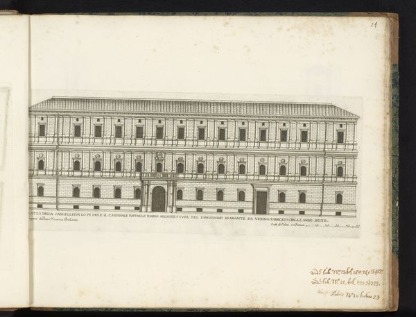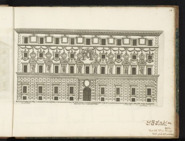 Curator: Here we have a drawing entitled "Zijgevel van Palazzo Borghese," or "Side View of Palazzo Borghese," dating from after 1655. It's attributed to Giovanni Battista Falda. The piece, rendered in ink on paper, resides here at the Rijksmuseum. Editor: It strikes me as remarkably restrained for a palace. There's a geometric, almost grid-like quality to the façade. I can't help but wonder about the social hierarchy embedded in such architectural rigidity. Curator: That’s a good point. Falda created these detailed architectural prints for a specific market, those interested in the projection of power and prestige of Rome’s elite families, which shaped urban spaces and consolidated political control through these buildings. Editor: Absolutely. Each window, each perfectly aligned detail, reinforces a sense of control, but the image also begs the question: who wasn’t allowed inside, both physically and symbolically? What does this rigidity convey about the period and class structure? The cool detachment seems calculated. Curator: Well, these structures functioned as stages for elaborate displays of wealth and influence, and these engravings served as promotional tools, circulating ideals about family prestige and urban grandeur. This particular drawing emphasizes order and classical proportion – ideas central to Baroque aesthetics as they expressed papal and aristocratic power. Editor: But how did ordinary people navigate this carefully constructed world? Did these imposing facades inspire awe or alienation? How did Falda’s representation reinforce, or perhaps subtly critique, existing power structures? Curator: He captured what patrons wanted to showcase. The focus on external symmetry can definitely seem divorced from the complex realities inside – the intricate politics and intense rivalries within these very families. These prints, meant for public consumption, offered a carefully curated image of stability and power. Editor: This drawing feels more like a calculated assertion of dominance than an invitation to experience beauty. It's a compelling example of how art and architecture serve ideological purposes, broadcasting and solidifying socio-political hierarchies. Curator: Considering the time and function gives us a valuable insight into not only the physical representation but also the cultural context this drawing represents. Editor: Indeed, it reminds us of art’s active role in shaping social perceptions and its complicated relationship to power dynamics.