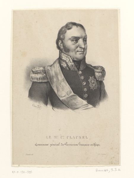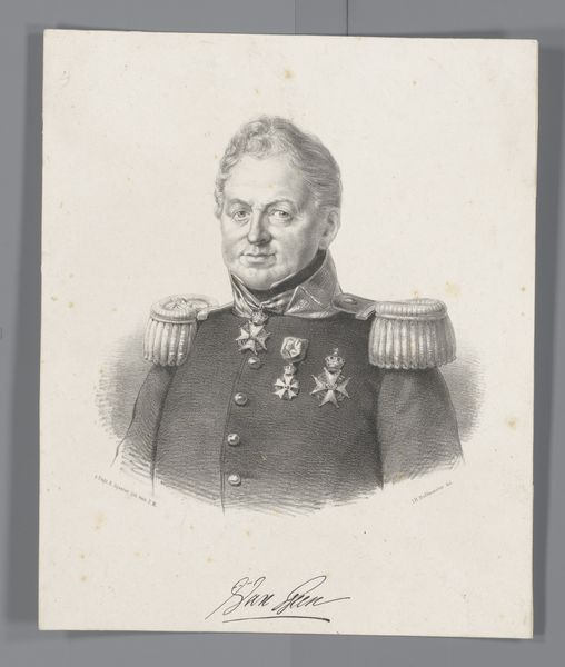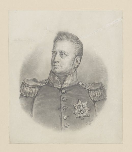 Editor: This is a pencil drawing called "Portret van Hendrik Merkus de Kock," made after 1854 by Isaac Cornelis Elink Sterk, currently held at the Rijksmuseum. The stern expression and formal military dress give him such an imposing presence. What can you tell me about the visual symbols? Curator: Note the weight of the uniform. Consider what it represents. In portraits like these, the uniform is a symbolic language—it's not just clothing, but a deliberate signifier. What cultural memory does military attire evoke for you? Editor: Discipline, power, maybe even conquest? It seems designed to project authority. Curator: Precisely. And observe how the artist renders the face. What feeling do you get from his gaze? Does it seem direct, confrontational, perhaps inviting analysis of psychological complexities? Editor: I think I feel an implicit power, but there's also… calculation? It’s almost like the eyes give more away than the stiff posture. Curator: Indeed. Artists of this time would try to use portraiture to fix identity and status but the subtle expressions often subvert those intentions, carrying hidden psychological depth that complicates any simple reading. This tension between presentation and perception interests me most. Do you see that echoed elsewhere? Editor: Perhaps in the delicate pencil strokes contrasting the rigid uniform? Curator: Exactly. The medium and the subject, held in balance and quiet conversation, that tension reflects the fascinating duality of cultural memory. Editor: So, it's a careful construction of both inner psychology and external power. Curator: Right. These images can transmit emotional and psychological weight, inviting deeper understandings that reflect both the subject and their cultural milieu. It gives us an image frozen in time but speaking of long echoes across time.
