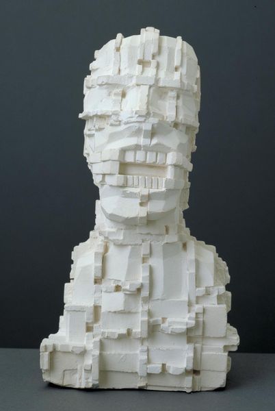 Curator: This is Tony Cragg's "Cumulus," part of the Tate Collections. It's a large sculpture, nearly three meters tall, constructed from glass and a multitude of white, cast glass vessels. Editor: My first impression is a sense of ethereal fragility, like a frozen waterfall. The monochrome palette adds to that feeling of something otherworldly. Curator: Cragg often explores the relationship between objects and the human form, and I think here we see a commentary on consumerism and the mass production of everyday items. Editor: Absolutely. The repetition of these familiar shapes, all rendered in this ghostly white, strips them of their individuality and speaks to the homogenizing effects of consumer culture. What do you think of the title? Curator: "Cumulus," a cloud formation. It evokes a sense of lightness and ephemerality, which is ironic considering the weight of the glass, and perhaps even hints at the environmental impact of mass production. Editor: It's a fascinating juxtaposition. The title pulls us towards the sky, while the form roots us firmly in the world of manufactured objects. I feel it's a powerful statement about our complex relationship with the material world.