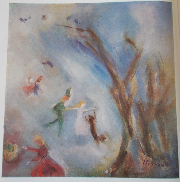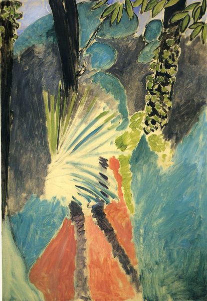 Curator: Gladys Kleinman’s watercolor drawing, “Bermuda Bound,” dating back to 1940, presents a rather intriguing composition. The work currently resides here at the Met. What’s your initial read on it? Editor: Utterly charming and a touch surreal! There's a whimsical theatricality to it, don't you think? The colors are so bright and a stylishly dressed lady seems to be striding through an otherworldly paradise. Curator: It’s interesting you say paradise, as Kleinman lived quite an isolated life. We understand her to be profoundly synesthetic, seeing colors in sounds and vice versa. This may explain the somewhat unconventional blending of figuration, landscape, and the abstract feel that wafts out from this. Editor: Ah, that explains the floating figures, doesn't it? Like echoes of leisure lifted from the land and now dancing in the air. Tennis racquets, swimming—symbols of carefree island life abstracted into almost spiritual presences. It is hard not to look at her composition without instantly making certain psychological interpretations... Curator: Precisely! The layering of elements, the palette…it’s as though the artist aimed to depict the emotional climate of a scene, and perhaps those figures were visitors or vacationers whom she witnessed during a rare sojourn into town. Or it could be merely the dreamscape where one hopes to wander someday. Editor: Note too how the woman strides with purpose holding those items close to her chest. This detail lends itself toward the lady feeling confident but perhaps even isolated in some ways. She is the central anchor as everyone else swims about. She must hold still and not leave this land and its attributes. It's an island with very fixed attributes. Curator: Yes, those symbolic elements feel significant. In many ways, it’s as if the watercolor served as a self-contained visual language of her impressions that allows us passage into her feelings and inner life. I’d venture to suggest this picture of paradise carries a deeper longing. Editor: I concur wholeheartedly. This innocent style contains entire continents of meaning! It makes you wonder: if art can unlock our vision, perhaps we, like the figures in the sky, might one day float a bit ourselves.