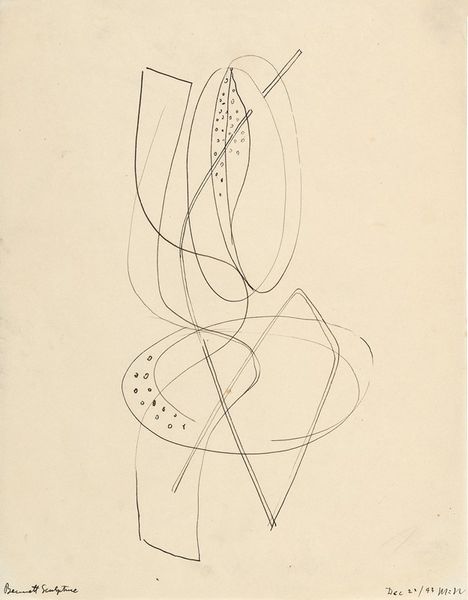 Curator: This is Stanley William Hayter's "Le Chas de l’aiguille," currently held in the Tate Collections. The image measures approximately 302 by 187 mm. Editor: My first impression is one of controlled chaos. The lines seem to dance, but there's a definite structure trying to emerge from the abstraction. Curator: Hayter was deeply engaged with Surrealism and automatism. This print exemplifies his innovative intaglio techniques, exploring the subconscious and the dynamics of line and form. The title translates to "The Eye of the Needle," suggesting themes of restriction and passage. Editor: Do you think the title connects to postwar anxieties? Is it a commentary on the limited opportunities or restricted freedoms individuals experienced during this period? Curator: Absolutely, given the historical context. Hayter's work often served as a response to societal constraints and existential inquiries, providing a visual language to express those tensions. Editor: Looking at it now, I wonder about the female form. Is that intentional? Curator: It could be argued that the ambiguous forms lend themselves to intersectional readings, touching on themes of gender and identity within shifting social landscapes. Editor: It's truly fascinating how a network of lines can provoke such layered interpretations. Curator: Indeed, Hayter's abstraction becomes a conduit for historical, social, and deeply personal reflections.