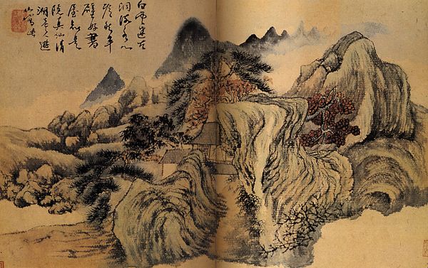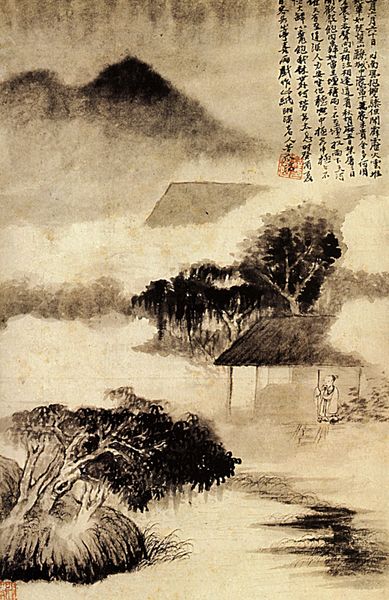 Curator: This is "Bathing Horses," created in 1699 by Shitao. It's an ink painting on paper, capturing a serene moment in nature. Editor: Immediately, I notice the dominance of washes. It lends the landscape this ethereal, almost dreamlike quality, softened by gradations in tonality. Curator: Precisely. Water, a crucial element here, symbolizes purification, renewal. The horses themselves, often associated with power and freedom, undergo this ritual cleansing. It mirrors our own desire for inner peace. Editor: I am interested in the way Shitao utilizes the negative space, it suggests boundless depth and a deliberate manipulation of figure-ground relationships, leading our eye deeper into the scenery. Curator: And consider the group of figures observing the horses; perhaps scholars or hermits, a recurring motif that hints at contemplation, withdrawing from the material world to appreciate beauty and reflect upon existence. Their observation echoes a cultural longing for a harmonious existence. Editor: Do you think that the blurring of boundaries and that intentional flattening of perspective contribute to the artwork’s emphasis on mood rather than representation? It is very poetic. Curator: Yes. In a cultural sense, water is liminal; a space for transitions and transformative experience, not just for horses. Editor: These layered motifs enrich the whole compositional framework, contributing toward an introspective contemplation regarding humanity’s link with nature and our quest for profound awareness. Curator: And indeed, “Bathing Horses" provides us with an insightful journey, an exploration of tradition that speaks volumes about the interconnectedness of existence. Editor: A clever composition with a timeless appeal.