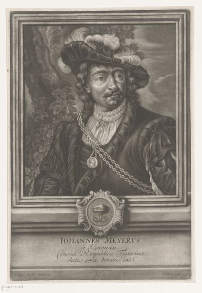 Sebastian Walch created this portrait of Rodolphus Meisius using engraving, a technique that lends itself to meticulous detail and striking tonal contrasts. The composition is structured around a framed portrait, lending a sense of formality and containment. Within this frame, Meisius is rendered with careful attention to texture, from the fur trim of his coat to the intricate lace at his collar. The use of light and shadow models his features, giving depth to his face and a lifelike presence. Walch's technique here seems to negotiate between surface and depth, challenging the viewer to question the limits of representation. The portrait invites a semiotic reading, with the symbols of status carefully arranged to convey Meisius's identity and position within society. The frame serves not only as a border, but as a structure that invites interpretation. The stark contrasts and precise lines of the engraving highlight the complexities inherent in the act of portraiture, suggesting that what we see is always a carefully constructed image.