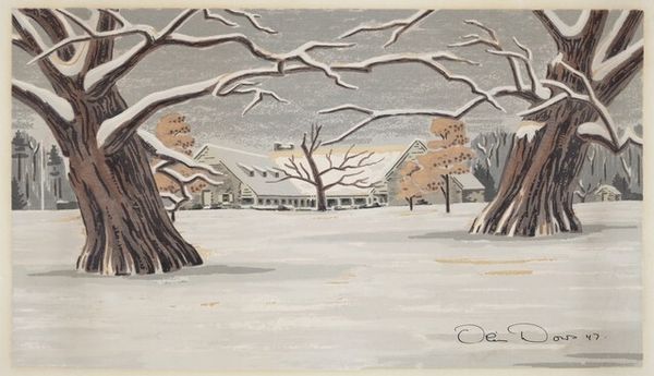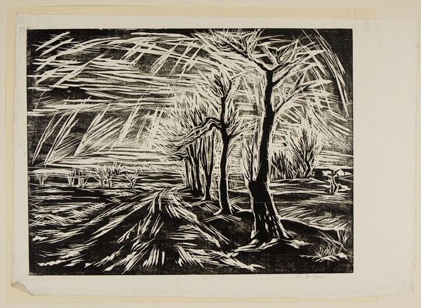 This is ‘Schaatsenrijders’, a print made by Bernard Essers, capturing a winter scene with skaters. The stark contrast between black and white is immediately striking. The composition, divided into sharp, angular forms, evokes a sense of a cold, crisp day. Essers masterfully uses the woodcut technique to reduce the landscape to its bare essentials. Note how the bare trees in the foreground frame the scene, leading your eye towards the skaters and the distant windmill, rendered as a simplified, almost geometric shape. The artist's limited palette forces us to focus on the interplay of light and shadow, giving the scene a dramatic quality. The figures, reduced to silhouettes, add to the formal arrangement without individualizing their stories. Essers simplifies form so that we read nature and people as graphic elements. This elevates the wintry landscape to an almost abstract pattern. Essers asks us to contemplate the formal elements, appreciating the visual structure for its own sake. The print serves as a reminder that art is not just about representation but also about the artist's creative manipulation of form and composition.