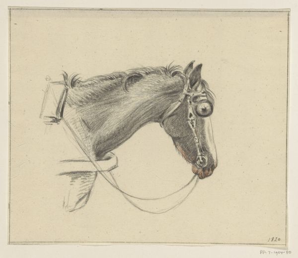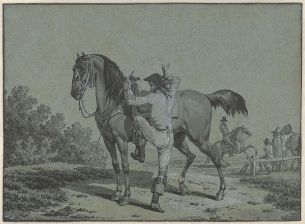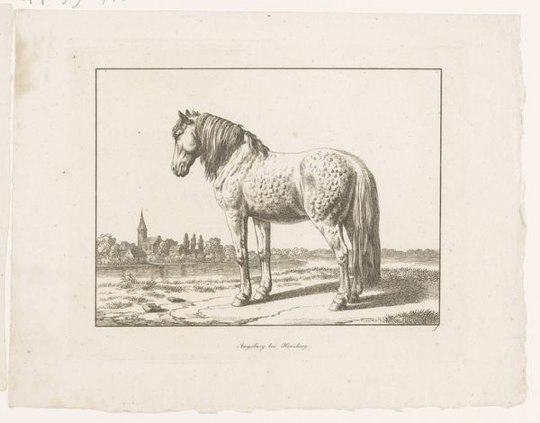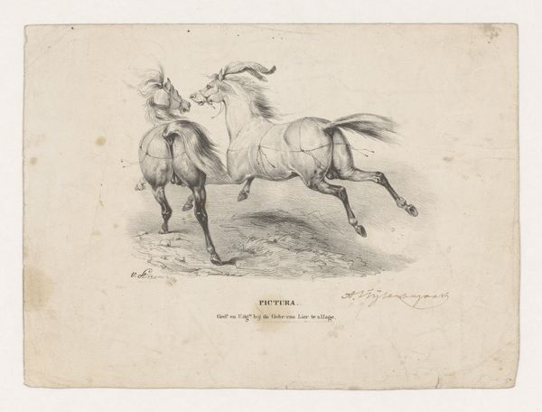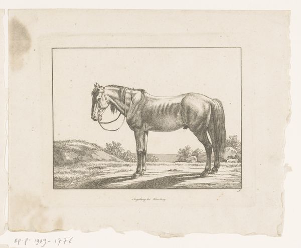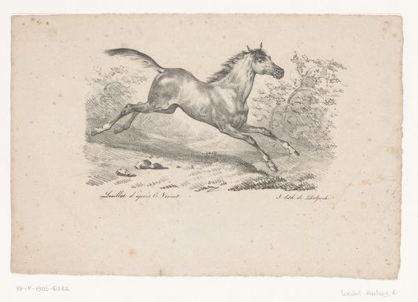 Editor: Here we have Pierre Jeantet’s 1827 engraving, *Achteruitslaand paard in een weiland*—or *Horse Kicking Backwards in a Meadow*. The horse appears very spirited, wild almost! What's your read of this, in terms of how Jeantet captures the animal's nature? Curator: It strikes me as freedom caught in a sketch. See how the horse isn’t simply *standing* in that field, but *leaping*—rearing, defiant, joyous even? It embodies the Romantic era's love affair with nature's untamed spirit. Almost like the horse is the embodiment of the landscape. Ever feel a landscape speaking back at you? Editor: That's beautiful! The landscape mirroring the horse, I hadn’t considered that. I’d initially focused solely on the horse, its individual energy… almost missing the broader conversation. Curator: Exactly! The "meadow" isn't just a backdrop. It’s whispering tales of freedom, space… perhaps even a challenge to the tamed world. That almost frantic energy that Romanticism always seems to embody. Editor: It’s interesting to consider the conversation between animal and landscape; the untamed in dialogue, challenging the more domesticated side of existence, isn’t it? I suppose this could say something more broadly of the 19th century as society became more civilized. Curator: You nailed it. I will say: there's a good splash of the absurd there too! Art isn’t always heavy thinking, right? Editor: A joyful release of energy and thought! That's something to consider for the artwork, beyond the heavy intellectualizing, huh? Thanks!