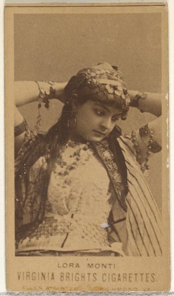 Curator: So, here we have a print entitled "Spain, from the Types of All Nations series," created in 1889 by Allen & Ginter. It’s currently housed at the Metropolitan Museum of Art. Tell me, what strikes you first? Editor: There’s such a delicate softness to it— almost a watercolor effect, despite being a print. And those colours, all muted, but with this inner luminosity… a certain nostalgic yearning, I feel. Curator: That’s interesting! Technically, it showcases a late 19th-century academic approach. Consider how the composition is carefully arranged to highlight elements of Spanish identity and costume, all fitting snugly inside this card format. The lines are crisp, yet there’s a painterly quality to the textures. Editor: But is it *really* about Spain, or about the *idea* of Spain packaged for a specific audience? The subject's gaze feels…dreamy, disconnected, perhaps embodying the exotic "other" for consumers back then. That flower perched in her hair...is that authentic, or purely ornamental for the gaze? Curator: Exactly! The "Types of All Nations" series speaks volumes about how cultures were commodified and understood. Allen & Ginter aimed for mass appeal through exoticism and classification. There’s this scientific aspect too; organizing the world in a neat, understandable package for a largely American audience. Editor: Makes me wonder about all the layers of representation. What gets amplified, what gets lost, and what biases are embedded when we try to define an entire nation through a single image? A beautiful, digestible stereotype, perhaps. Curator: Precisely! We’re seeing not so much a faithful representation, but a curated presentation that fit with pre-existing notions. It’s a reminder that images always operate within complex systems of power and meaning. Editor: I came in thinking romantic nostalgia, now I'm contemplating commodity, stereotype, and cultural diffusion all neatly tucked inside a cigarette card. Art continues to surprise me, just when you expect it least.