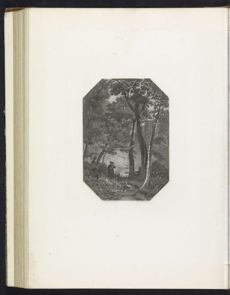 Curator: Welcome. Before us is a print attributed to Willem Steelink, titled "Jacob van Ruysdael, ca. 1670," and believed to have been created between 1865 and 1870. The etching on paper evokes, perhaps unsurprisingly, the landscapes of its namesake. Editor: My initial impression is one of stillness, but with a hint of foreboding. The monochromatic palette lends a solemn air, while the somewhat severe architectural geometry of the building jars against the unruly organic forms surrounding it. It presents a stark reminder of the human imposition on nature. Curator: Steelink expertly uses the etching technique to create varied textures and tonal ranges. Observe the meticulous detail in the rendering of foliage compared to the rough-hewn appearance of the building’s siding, and consider how this contrast manipulates space and focus in the composition. Editor: Indeed. The placement of the figures seems deliberate—almost alienated from the landscape itself, certainly marginalized to the pictorial periphery. This could suggest commentary on the status of the figure relative to larger forces in the 19th century: industry, the natural environment, societal change. The solitary man perhaps speaks to emerging and changing concepts of class in the Dutch landscape tradition. Curator: Your reading is not unfounded. However, before we begin framing artwork with complex historical overlays, is it necessary to note the composition's sophisticated exploitation of chiaroscuro? Notice how strategically Steelink uses light and shadow to sculpt forms and guide our eyes? It's pure visual poetry. Editor: Yes, of course, though the 'poetry' you identify can’t be divorced from the material and historical circumstances surrounding this image, can it? Steelink didn't work in a vacuum. The image invites us to reflect not only on its form but also its engagement with broader questions of environmental responsibility and social alienation that continue to be extremely relevant today. Curator: A persuasive perspective. By recognizing how Steelink plays with conventional composition strategies, he ultimately elevates this etching above mere technical reproduction and situates it as an enduring landscape tradition. Editor: Ultimately, the image compels us to grapple with questions about place, labor, and social identity across centuries.