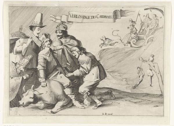 Curator: This is Théophile Alexandre Steinlen's "Les Camarades," created in 1917 using etching and ink. It’s a haunting piece. What strikes you first? Editor: It’s the overwhelming darkness. The somber atmosphere immediately speaks of loss and the brutal realities of war. The low tonal range focuses my eye on the soldiers themselves. Curator: Note how Steinlen uses a network of tightly rendered, linear strokes to define form but also imbue the scene with that sense of oppressive dread. It's masterfully achieved. This reflects the common theme in Steinlen’s work—the impact of societal forces on human beings. Here, of course, that force is war. Editor: The soldiers carrying their fallen comrade are so burdened. I see the motif of sacrifice; one gives their life, the others give their strength in carrying their compatriot from the dark foreground to an even darker background of barbed wire and shattered tree trunks. There is a sense of almost religious martyrdom present. Curator: The stark contrast between the lit figures and the darkness beyond effectively leads your eye. Look closely, and you can almost see the weight they bear—literally and figuratively etched into their posture and their faces. There's almost no individual characterization here, the lines give us posture, and that tells the entire story of pain and labor. Editor: Exactly, and those sharp lines are essential to my reading of the work—a jaggedness in keeping with both its subject matter and function as a stark indictment of war’s devastation and the destruction of not only people but also basic bonds of fraternity and honor. "Les Camarades"—the comrades. There is great depth here, a shared cultural understanding is being passed to future generations through powerful imagery. Curator: The deliberate arrangement certainly emphasizes these universal experiences, stripping away any specifics for an inclusive impact on viewers. This image remains sadly relevant, speaking to an ever-present cycle of conflict. Editor: Yes, Steinlen captures the emotional weight through simple imagery, the burden of duty. Ultimately, it transcends the specifics of any single conflict, entering into cultural memory.