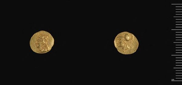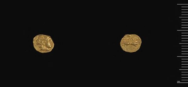 Editor: Here we have a gold tenth stater coin of Nikokles, King of Salamis. I find it amazing that something so small could carry so much historical weight, literally! What can you tell me about this piece? Curator: This coin is a powerful example of how rulers use imagery to project authority and solidify their place in history. Considering its function as currency, its circulation would have widely disseminated Nikokles' image and, by extension, his power. Editor: So, in a way, it's a form of ancient propaganda? Curator: Precisely! How does this coin speak to you about Nikokles' ambition and Salamis' role in the broader political landscape of the time? Editor: I hadn't thought about it that way before. It’s interesting to consider how something as simple as a coin could be a tool for shaping public perception. Curator: Indeed. It's a reminder that even the smallest objects can tell big stories about power, politics, and public image.